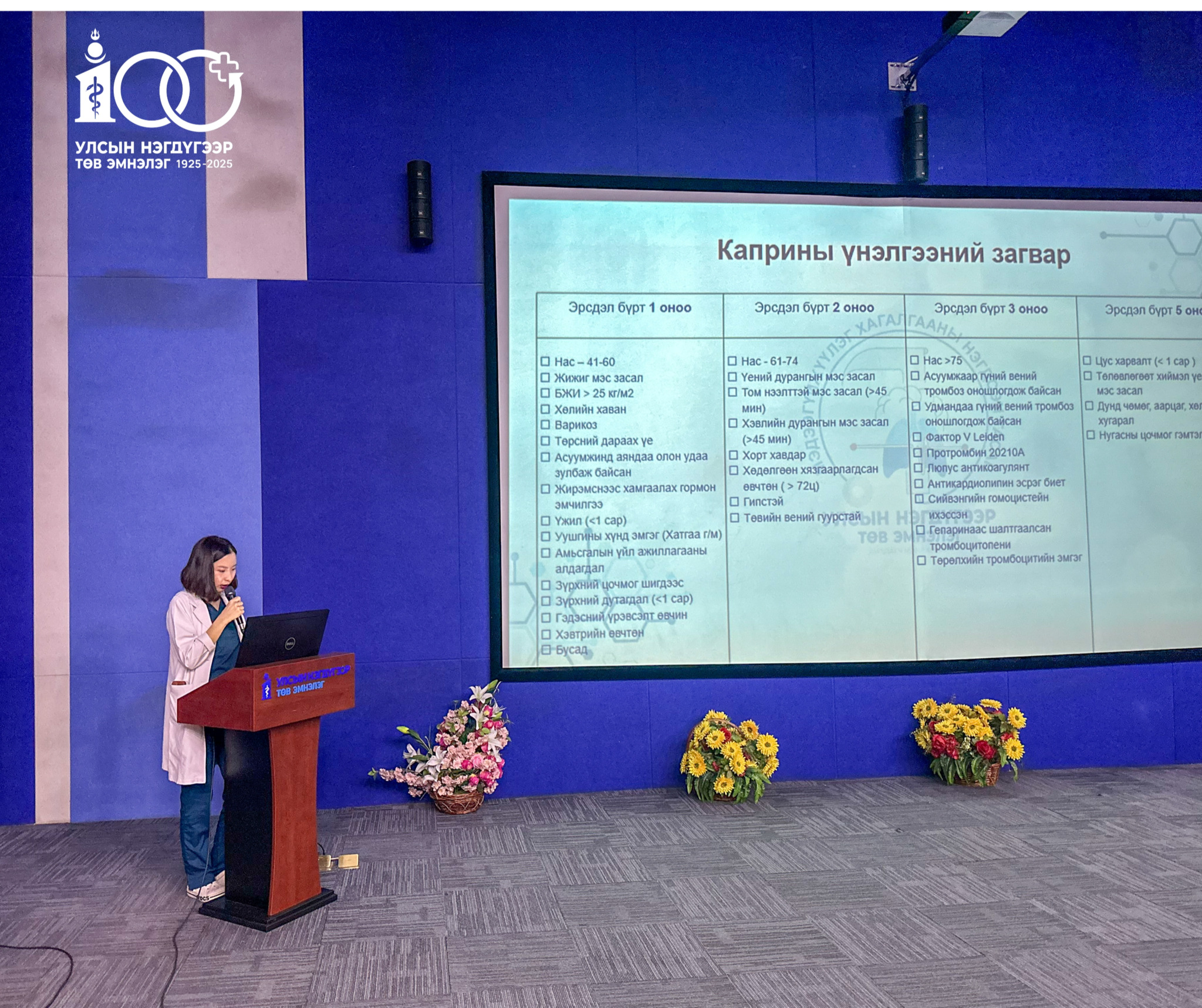 • Мэдээгүйжүүлэг судлалын 1-р дамжааны резидент эмч Б.Отгонжаргал, Б.Баттуяа нар " Хүнд өвчтэй мэс засал хийлгэсэн эмчлүүлэгчдэд венийн тромбоэмболизмийн эрсдэлийн Каприны үнэлгээний загварыг батлах нь " сэдэвт №014 дах судалгааг тус тус амжилттай танилцууллаа.