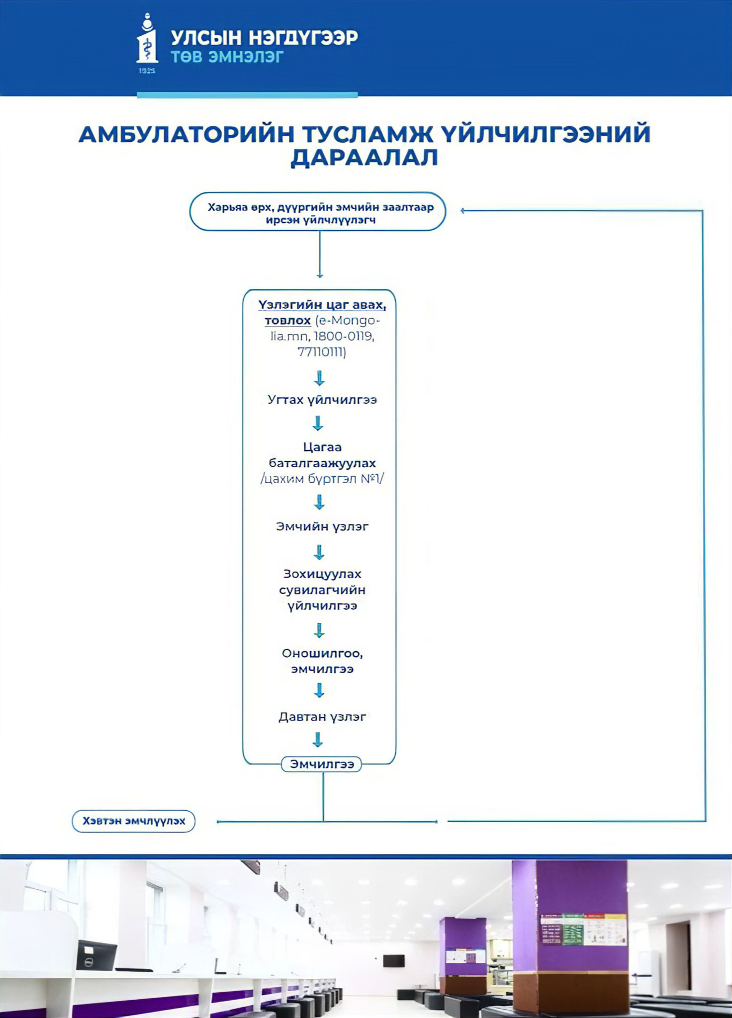 Улсын Нэгдүгээр Төв Эмнэлэгээр үйлчлүүлэхдээ өөрийн биеэр болон утсаар эмчид үзүүлэх дугаарыг цахим бүртгэгчээс авч үйлчлүүлнэ.
